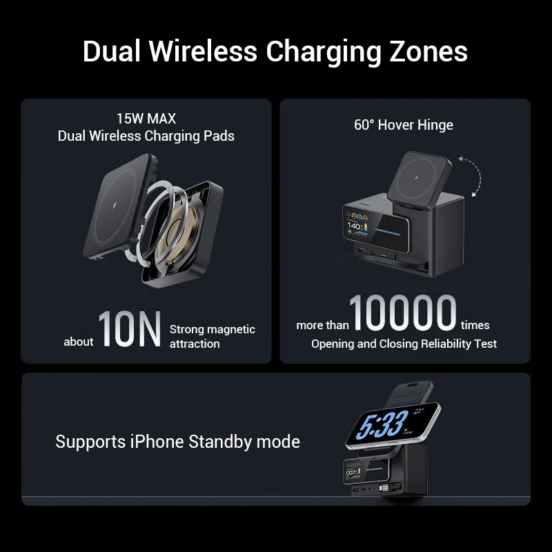 Bạn có thể sạc đồng thời nhiều thiết bị khác nhau, từ MacBook, iPad, iPhone đến các thiết bị Android, tai nghe, đồng hồ thông minh và cả pin sạc dự phòng. Khả năng phân phối điện năng thông minh giúp đảm bảo mỗi thiết bị đều nhận được mức sạc tối ưu.