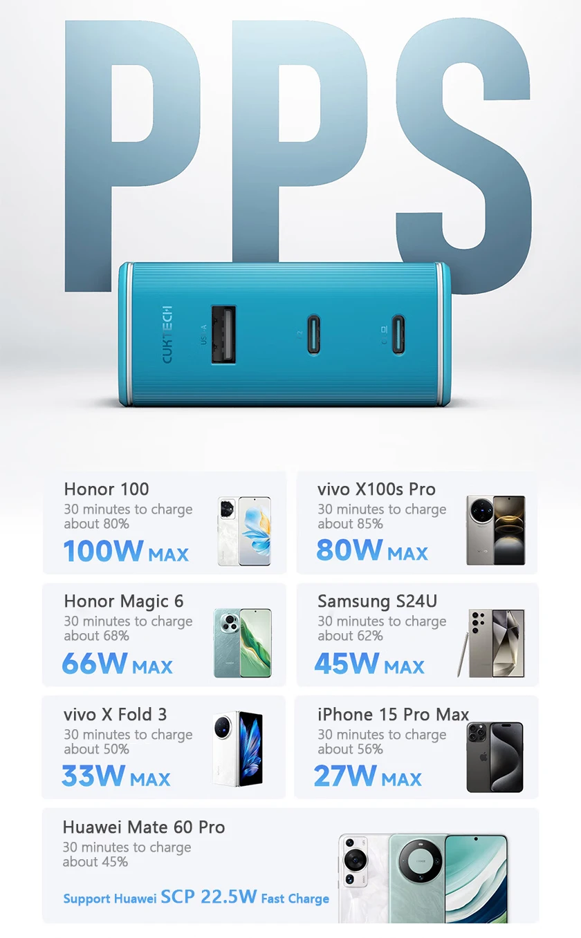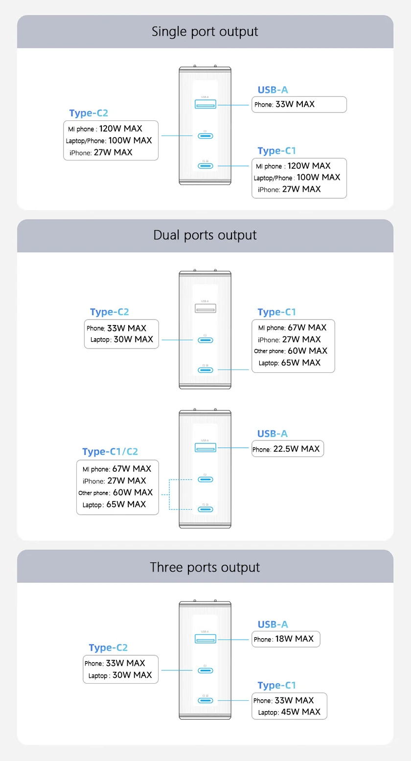 Type-C1/C2 Output:5V-3A, 9V-3A, 11V-6.1A, 12V-3A, 15V-3A, 20V-5A, 20V-6A Max 120W (PPS 5-11V/5A; 5-20V/3A)