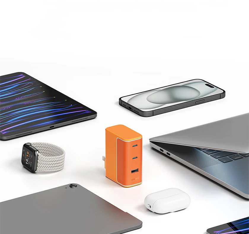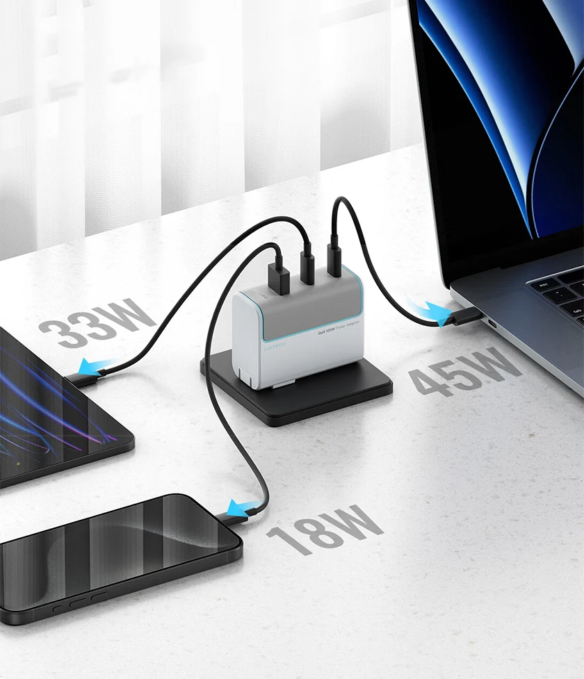 - Chip thông minh phân bổ dòng điện: Khi sạc nhiều thiết bị cùng lúc (ví dụ: sạc 1 laptop, 1 điện thoại và 1 tai nghe Bluetooth), củ sạc sẽ tự động điều tiết và chia điện thông minh để đảm bảo thiết bị nào cũng nhận được tốc độ sạc tối ưu và an toàn nhất.