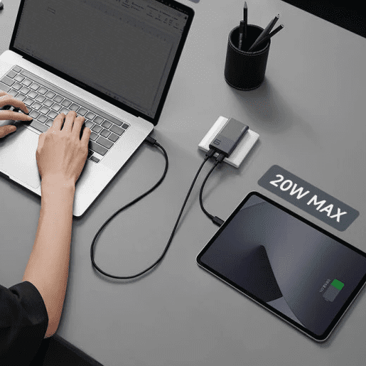 Được trang bị 2 cổng USB-C, củ sạc cho phép bạn nạp năng lượng đồng thời cho 2 thiết bị. Nhờ vi mạch phân phối điện thông minh, nguồn điện sẽ được tự động điều chỉnh linh hoạt (ví dụ: 45W cho laptop + 20W cho điện thoại) để tối ưu hóa thời gian sạc mà không làm suy giảm tuổi thọ pin. Đặc biệt, hãng còn ưu ái tặng kèm một sợi cáp C to C 6A dài 1.5m, giúp bạn sẵn sàng sử dụng ngay khi mở hộp.