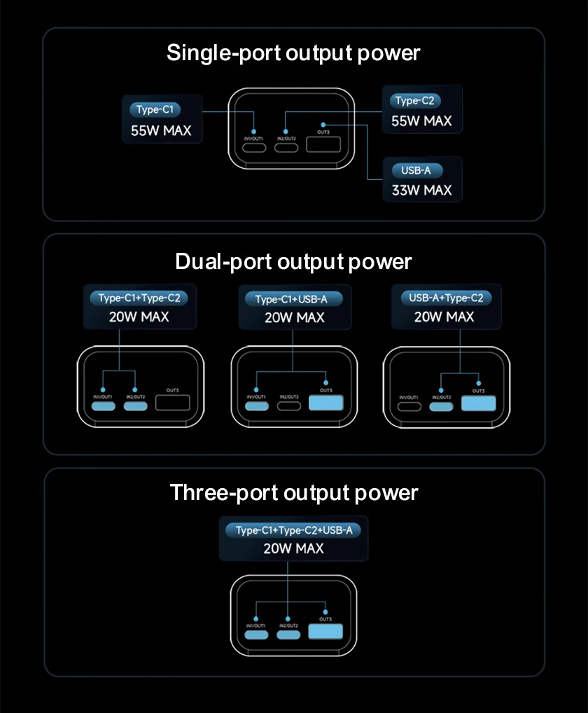 OUT1(Type-C1): 5V/3A, 9V/3A, 12V/3A, 15V/3A, 20V/2A, 5-20V/2.5A, 5-11V/5A 55W MAX