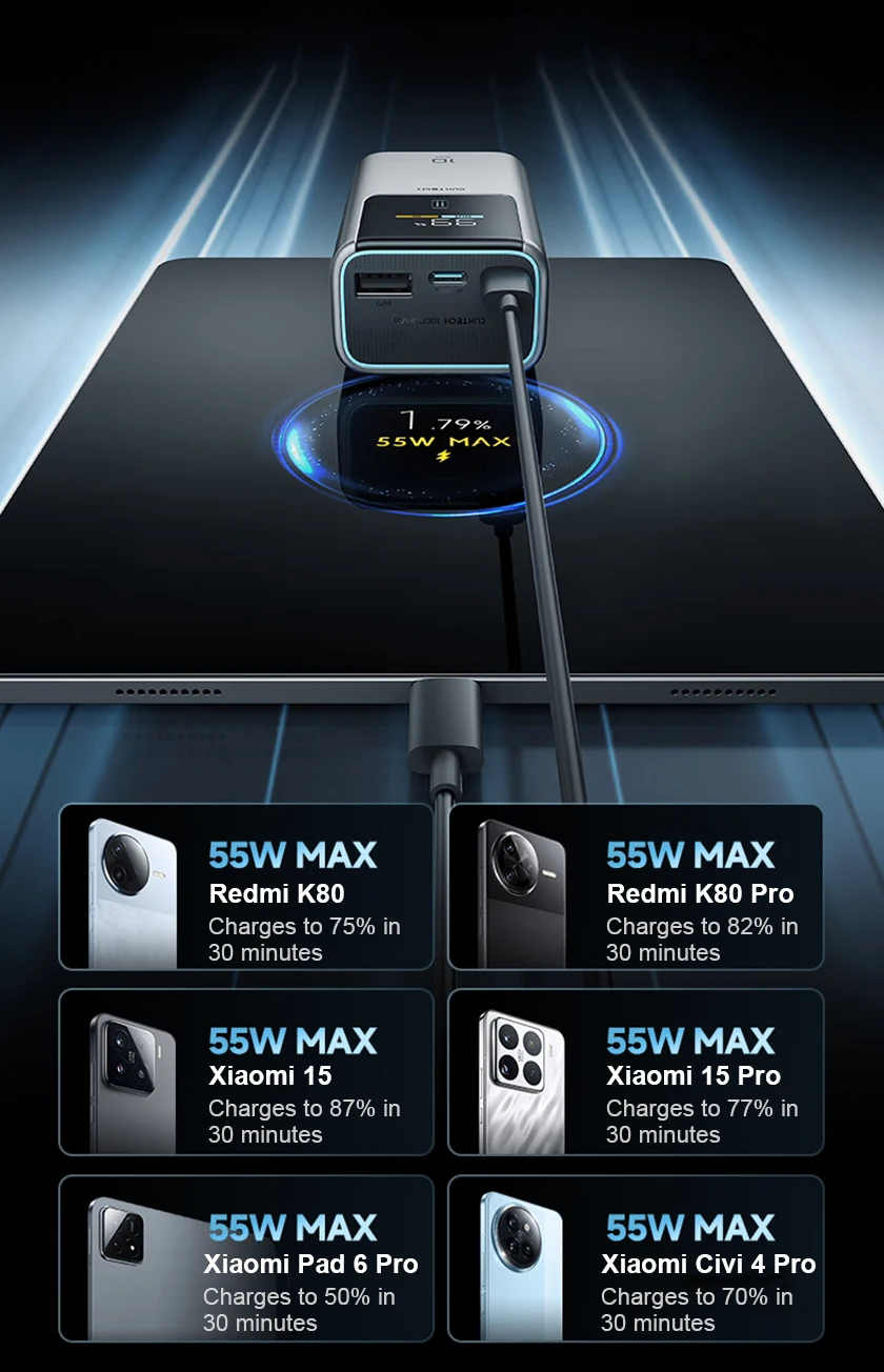 Compatible with PD, PPS, Xiaomi Fast Charging, UFCS Fusion Fast Charging, Huawei SCP 22.5W Fast Charging, and other fast charging protocols.