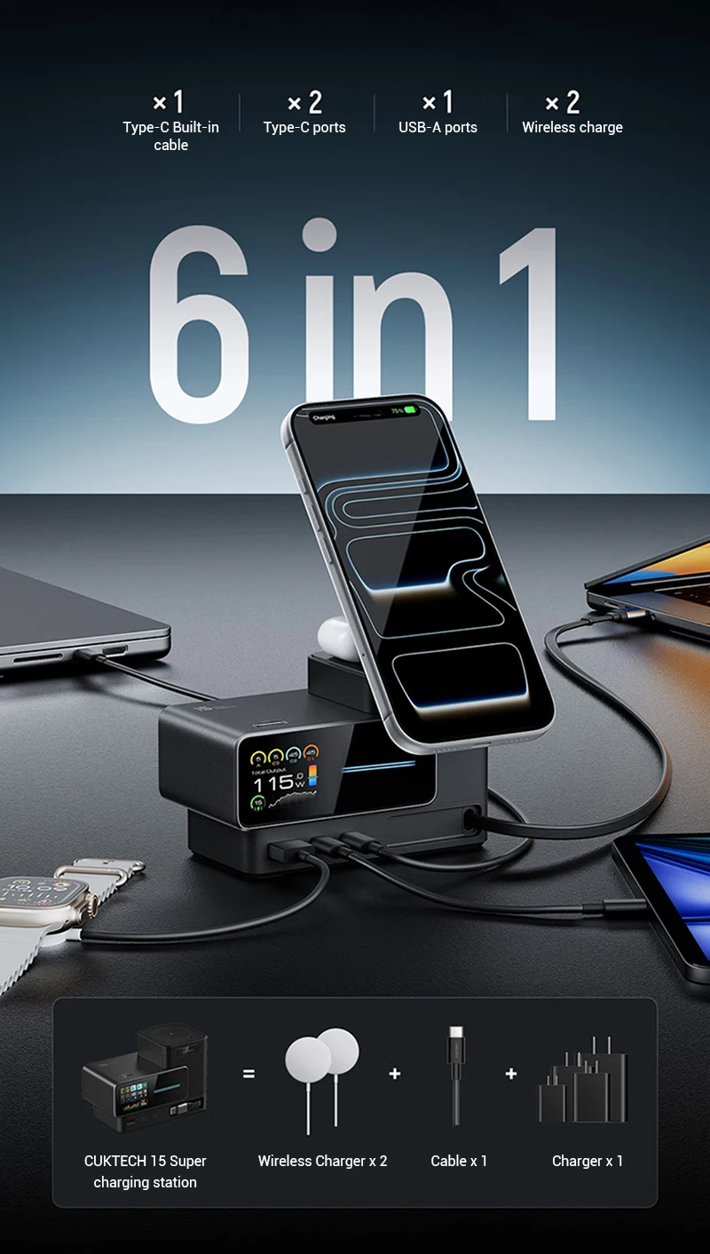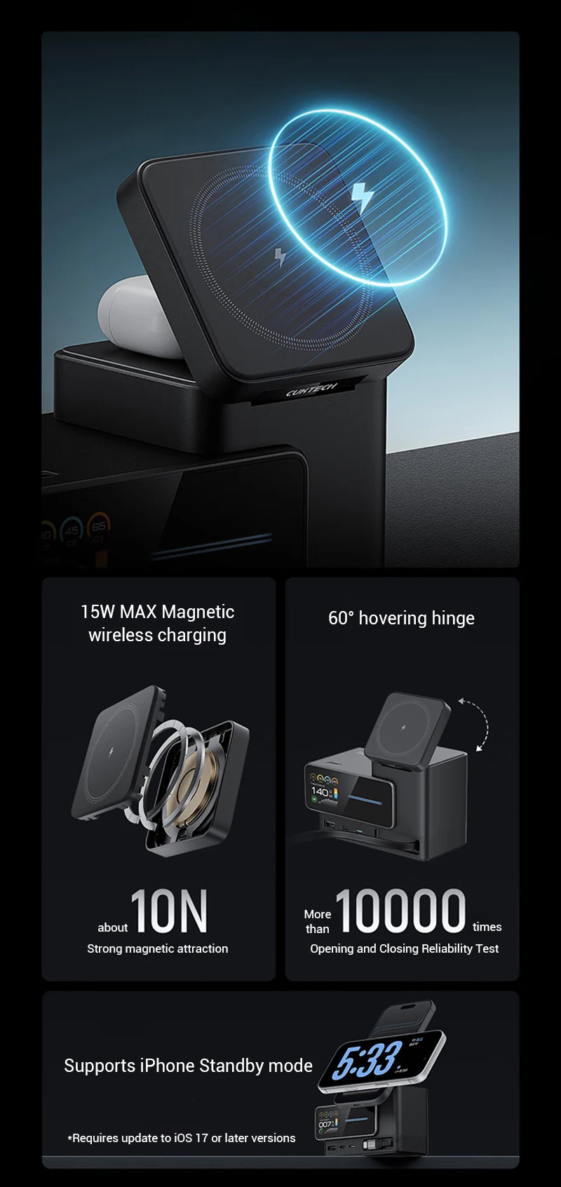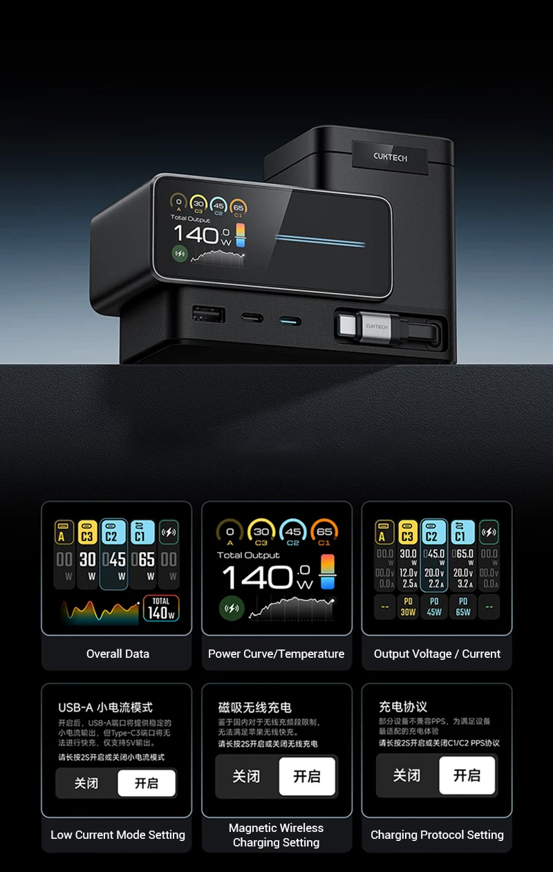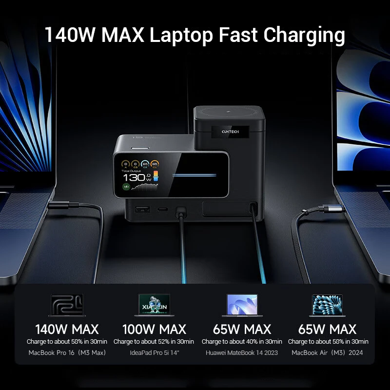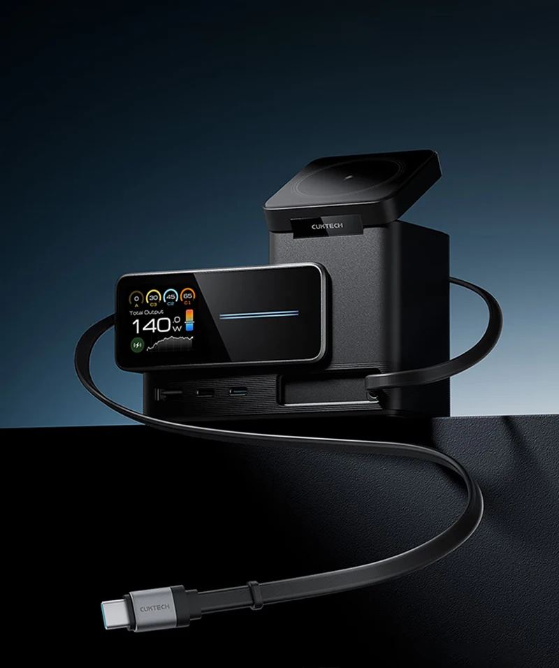 CUKTECH 15 Charging Station 140W GaN USB-C Retractable Cable Wireless Charge 1.83″ TFT Display For Xiaomi iPhone MacBook Laptop