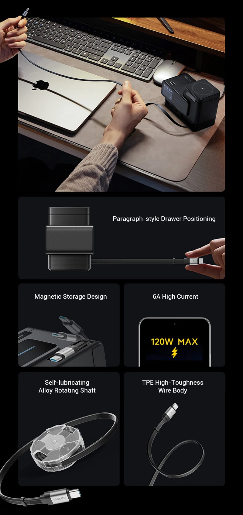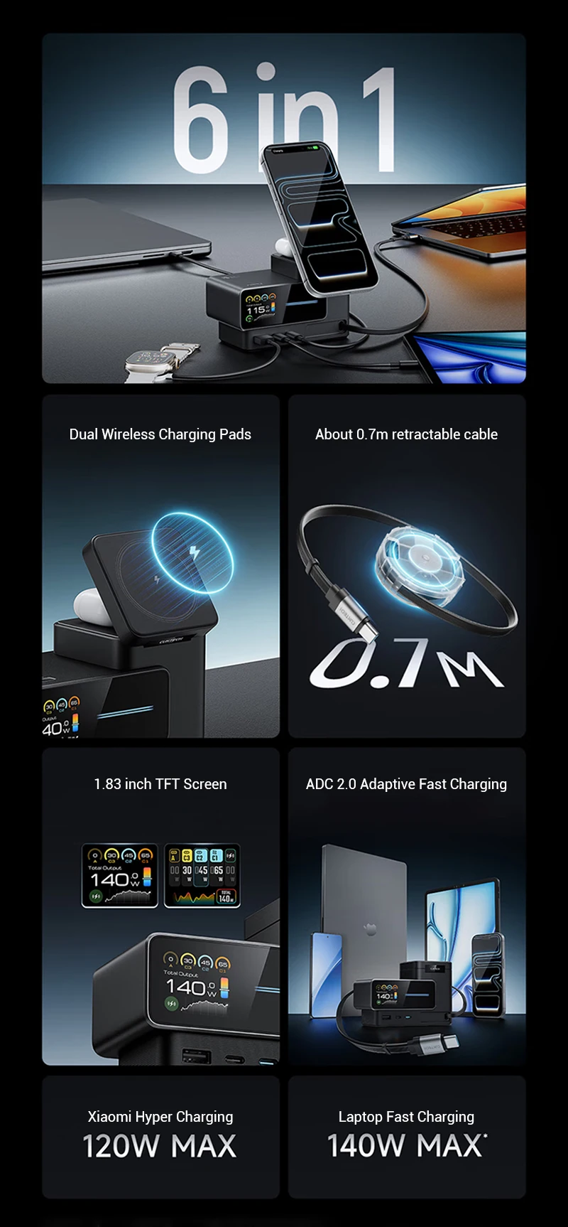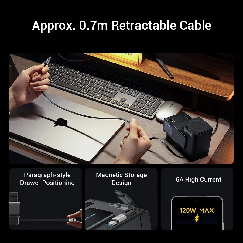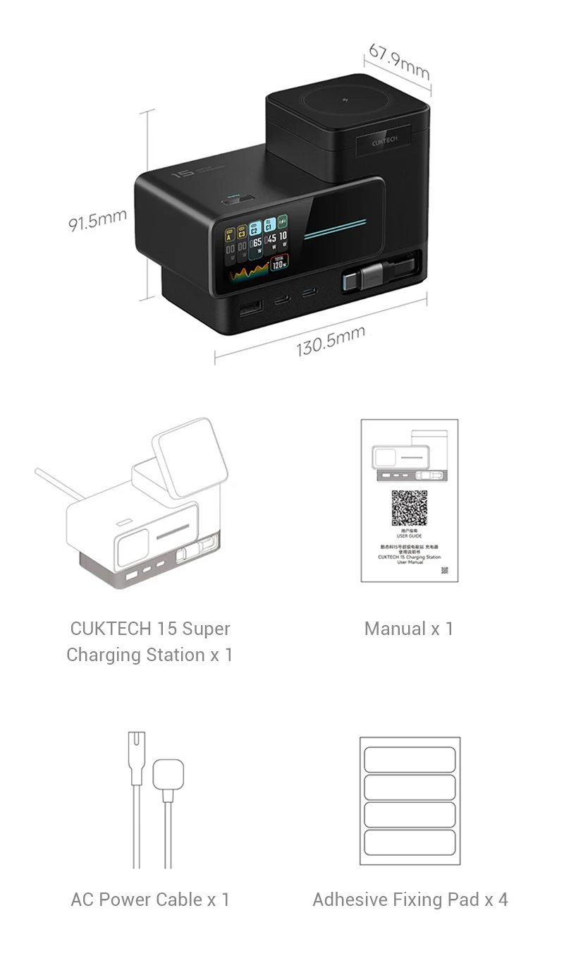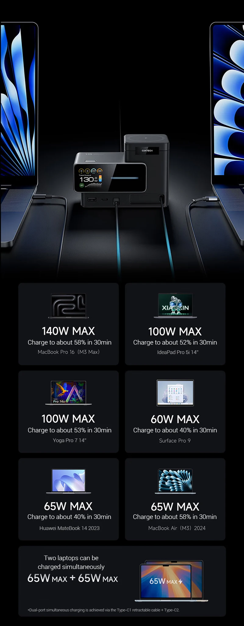 CUKTECH 15 Charging Station 140W GaN USB-C Retractable Cable Wireless Charge 1.83″ TFT Display For Xiaomi iPhone MacBook Laptop