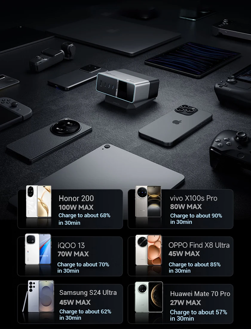 Compatible with PD 3.1 140W, PPS 100W, Xiaomi 120W, UFCS Fusion Fast Charging 44W, Huawei SCP 22.5W, QC, AFC, and other 13 mainstream fast charging protocols in the market.