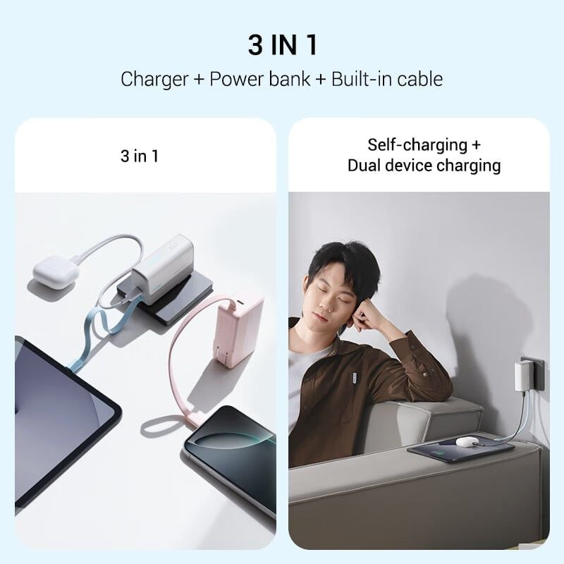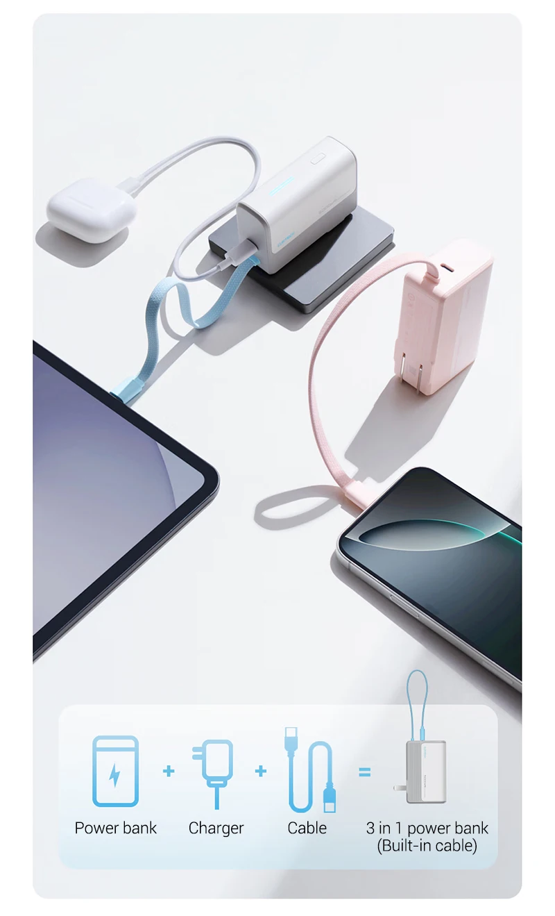 Sản phẩm đi kèm một sợi cáp Type-C gắn liền, giúp bạn không còn phải lo lắng về việc quên hay mang theo dây sạc rườm rà.