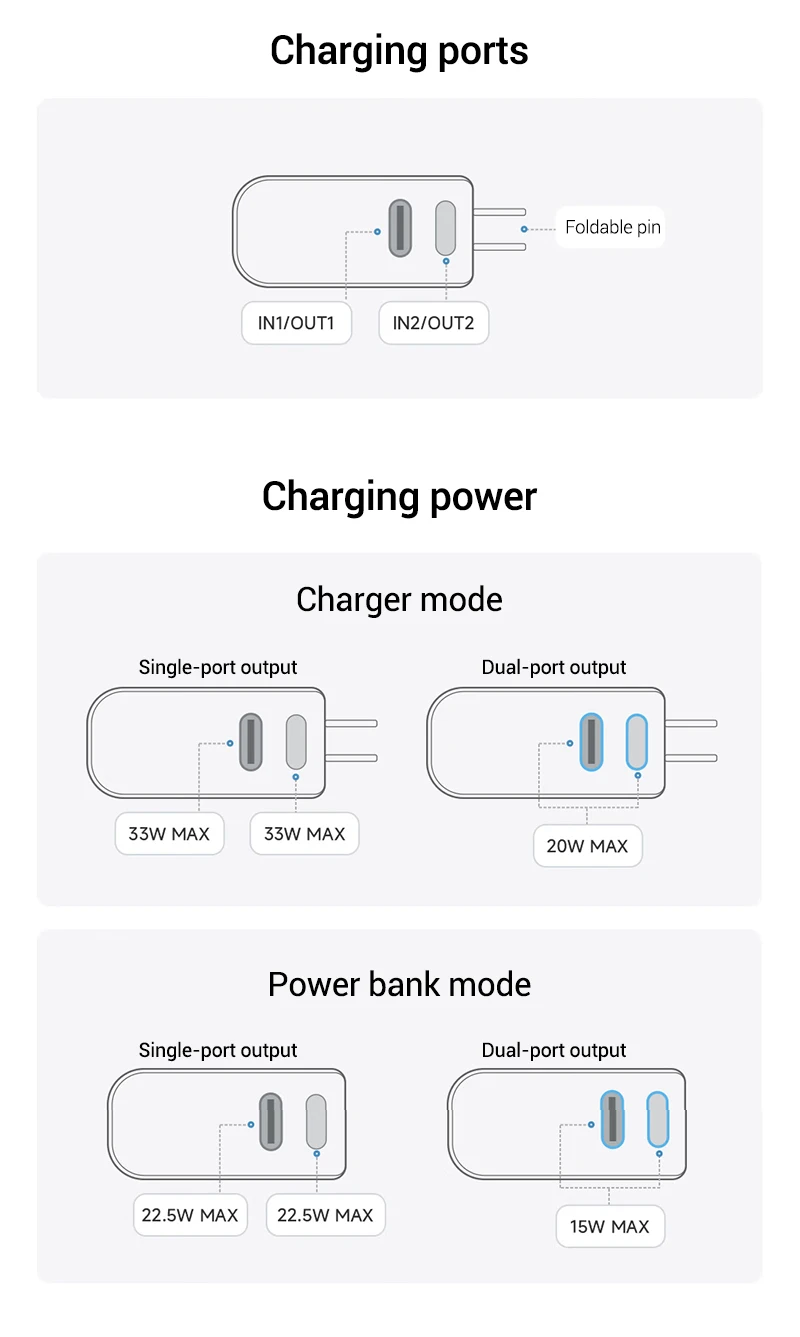 Single port: 5V/3A, 9V/3A, 11V/3A, 12V/2.5A, 15V/-2A, 20V/1.5A 33W Max