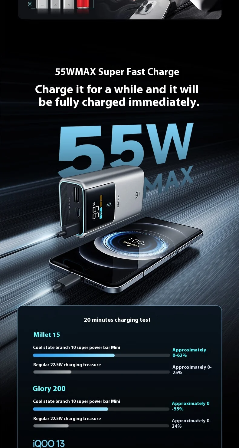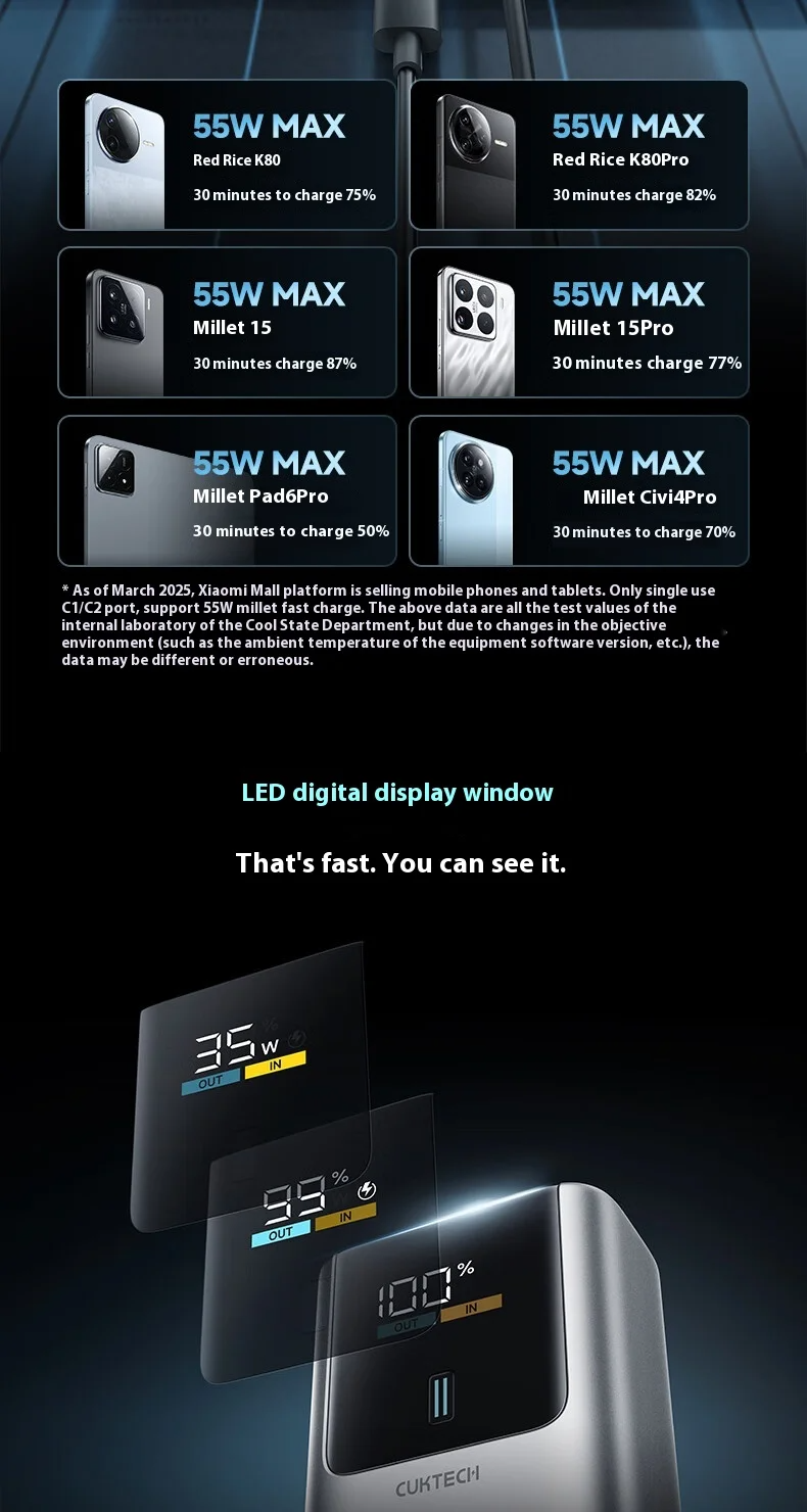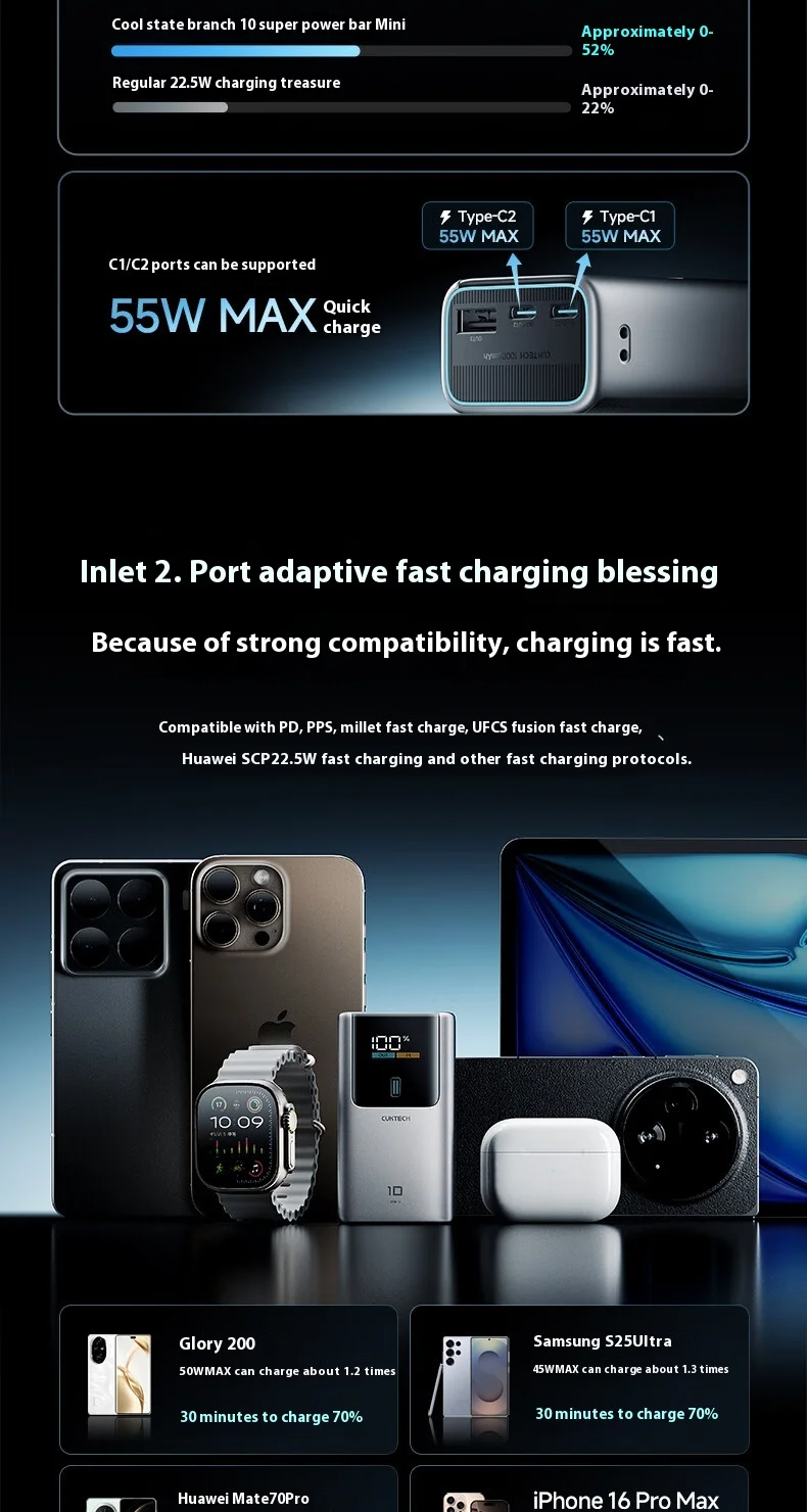 Đây là điểm nhấn ấn tượng nhất. Với công suất tối đa 55W qua cổng USB-C, Cuktech 10 Mini không chỉ sạc siêu tốc cho các dòng điện thoại cao cấp (đặc biệt tối ưu cho các dòng máy của Xiaomi) mà còn đủ sức cung cấp năng lượng cho một số mẫu laptop ultra-portable và máy tính bảng, điều mà hiếm có viên pin mini nào làm được.
