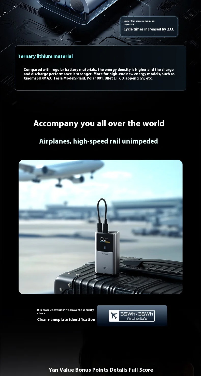 Với dung lượng điện năng chỉ khoảng 36Wh (thấp hơn nhiều so với giới hạn 100Wh của các hãng hàng không), Cuktech 10 Mini là người bạn đồng hành lý tưởng, cho phép bạn yên tâm mang theo trong hành lý xách tay trên mọi chuyến bay.