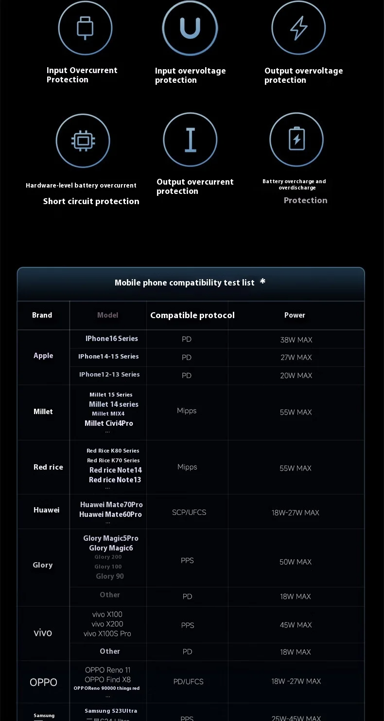 IN2 (Type-C2): 5V/3A, 9V/3A, 12V/3A, 15V/3A, 5-11V / 5A