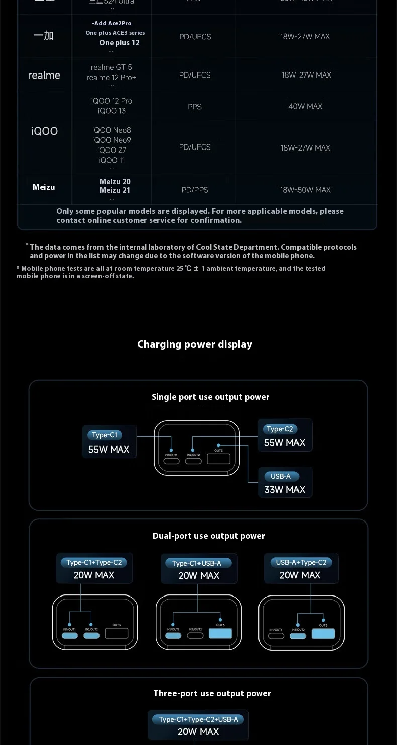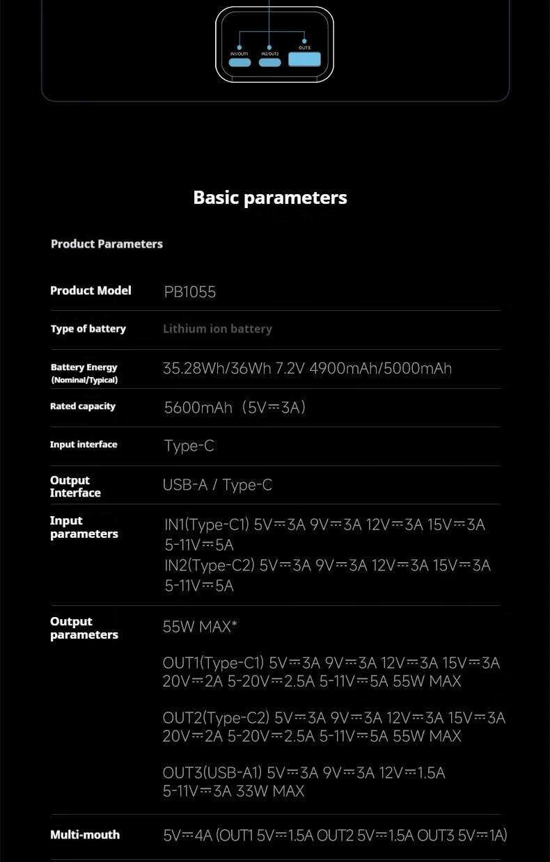 OUT1 (Type-C1): 5V/3A, 9V/3A, 12V/3A, 15V/3A, 20V/2A, 5-20V/2.5A, 5-11V/5A (55W MAX)