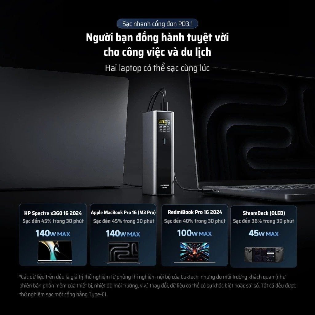 Cuktech 15 Ultra hỗ trợ công suất sạc nhanh lên tới 165 W nếu sạc bằng 2 cổng Type-C đồng thời — đảm bảo nạp đầy pin trong khoảng 45 phút.