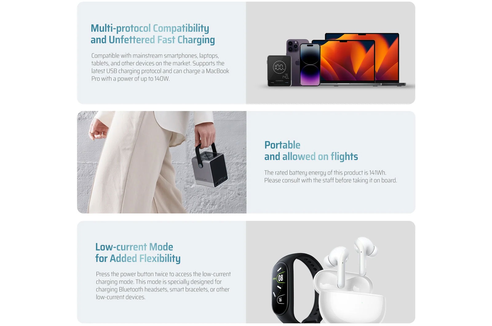 – OUT4(USB-A2): 5V/3A 9V/3A 12V/3A 15V/3A 20V/6A 120W MAX