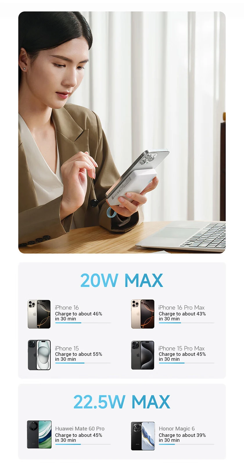 OUT1: Type-C Port: 5V–3A, 9V–2.22A, 10V–2.25A, 22.5W MAX