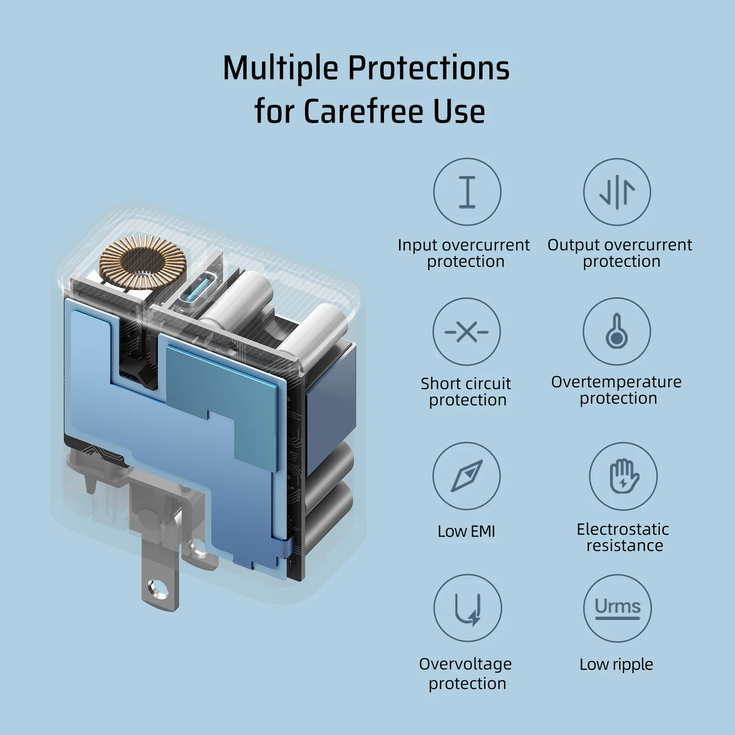 • Bảo đảm An toàn: 8 cơ chế bảo vệ an toàn đảm bảo hoàn toàn không gặp vấn đề như quá nhiệt, quá dòng, mạch ngắn, tĩnh điện, v.v. Trong quá trình sạc, bạn có thể yên tâm và tận hưởng việc sạc mà không lo lắng.